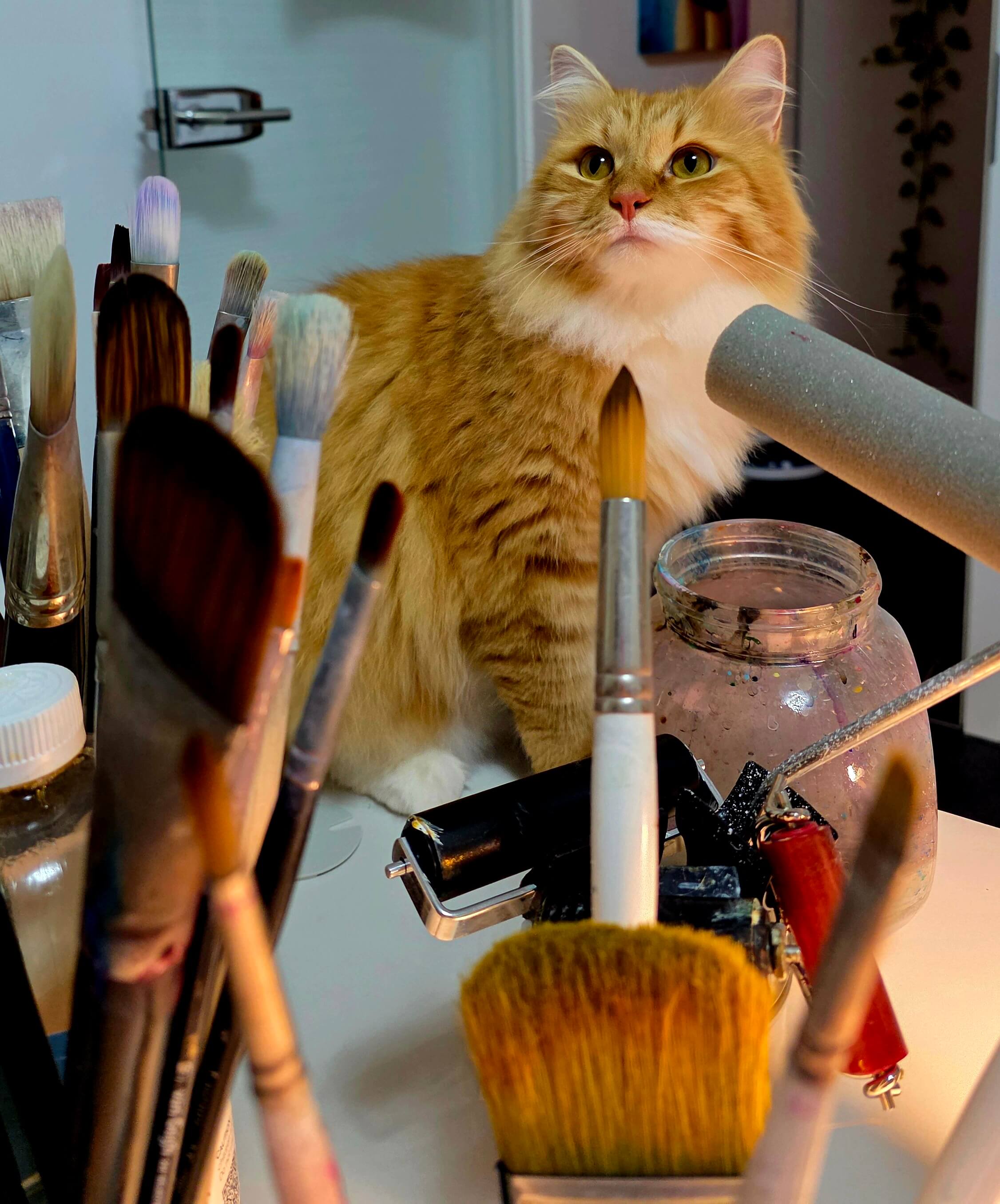Abigail critiques the works while they are in progress and generally keeps an eye on things in the studio. Sometimes she sleeps on the job, but during her waking hours she exercises the highest level of diligence in her oversight duties.